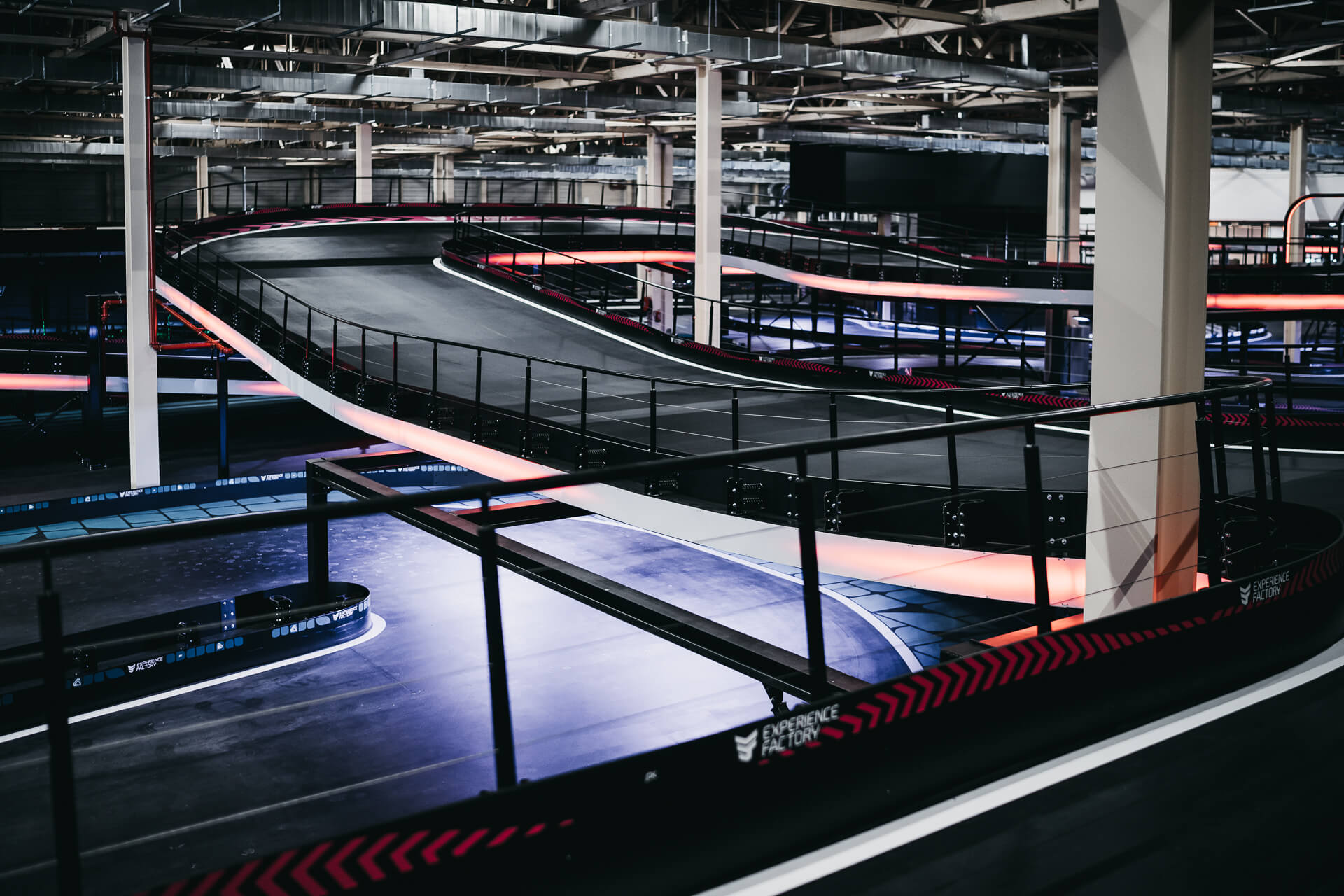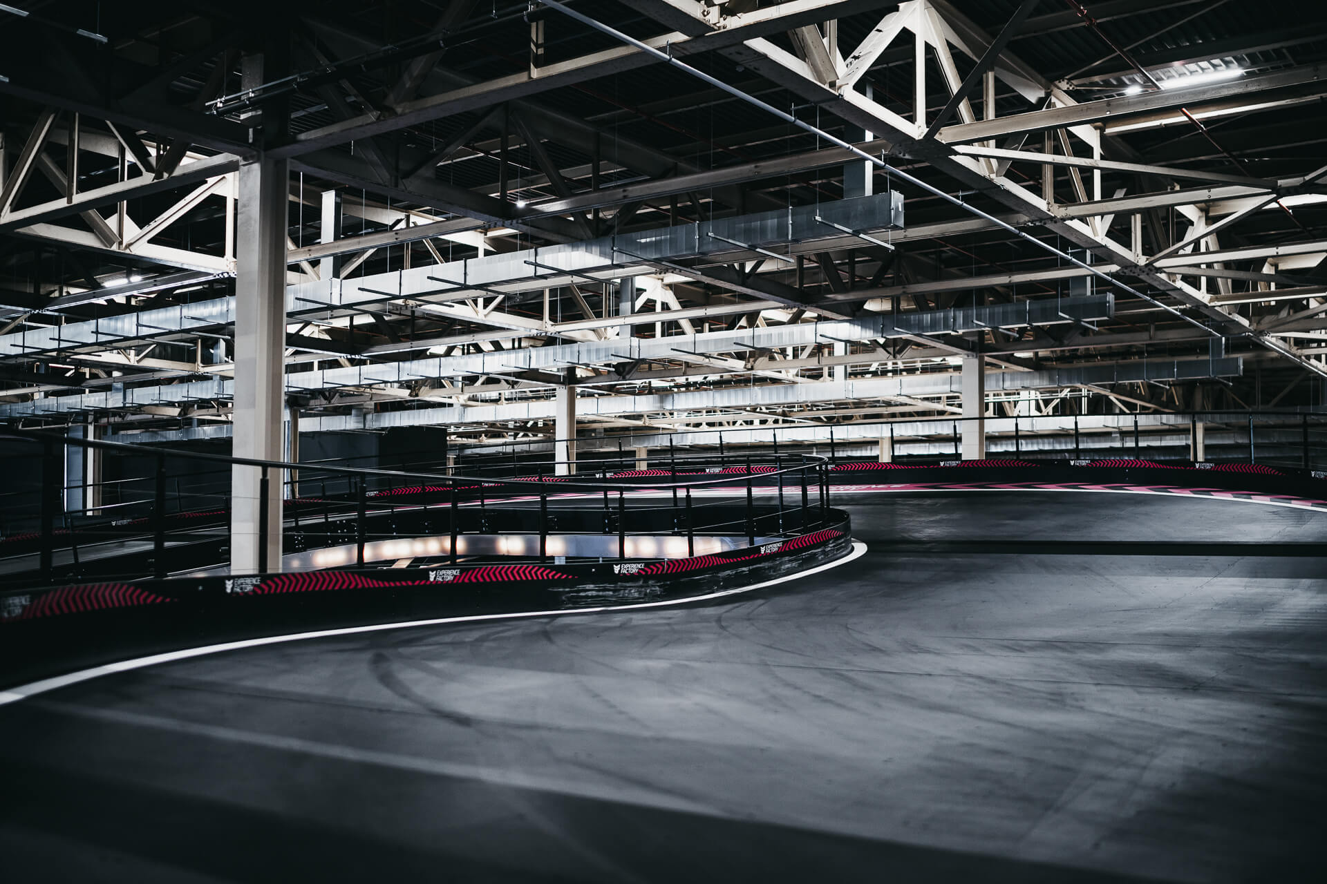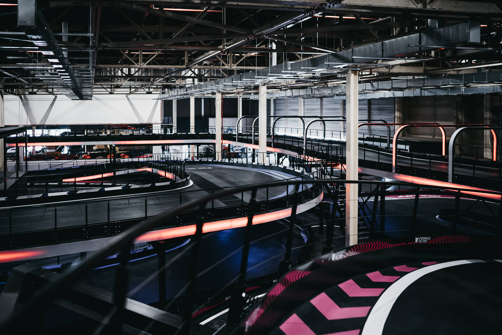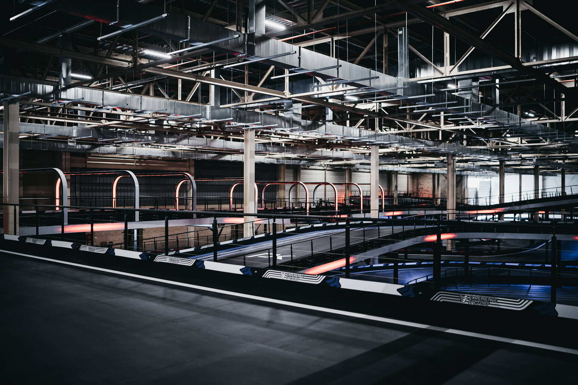 Experience Factory Antwerp is a landmark entertainment destination and a centerpiece in modern indoor karting, delivered by ProKarting as the bespoke designer and builder of the venue’s signature e-karting track. The project reimagines a former industrial hall into a high-profile competitive socializing hub, anchored by Europe’s largest 3-level indoor e-karting circuit.